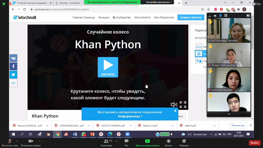 Информатика пәні мұғалімі Абдураимова Рая Акилбековна Wordwall ресурсы интерактивті және баспа материалдарын жасау үшін пайдаланылуы мүмкіндік беретін сервис туралы толық мәлімет берді.