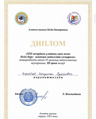 «XXI ғасырдағы ұлттық сана және білім беру: заманауи педагогтің көзқарасы» тақырыбында өткен IV қалалық педагогикалық оқуларының III ?орын иегері лицейіміздің физика пәні мұғалімі Қарсыбаев Бексұлтан Тулегенович марапатталды!!!