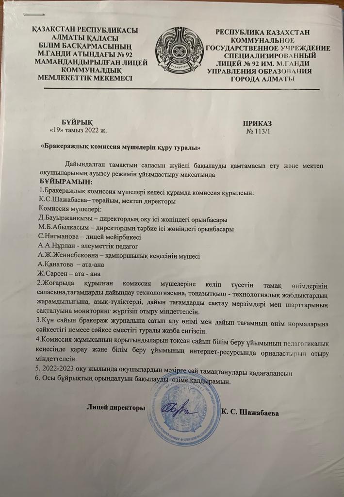 Бракераждық комиссия мүшелерін құру туралы 2021-2022оқу жылы