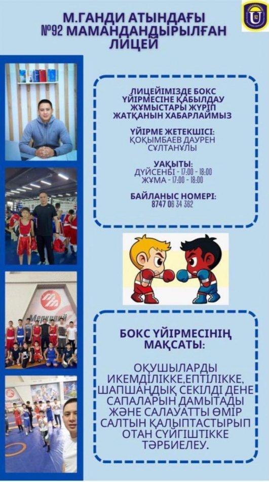 19 сентябрь 2022 0 1 2 3 4 5 Бокс үйірмесі ? Хабарландыру!М.Ганди атындағы №92 мамандандырылған лицейде бокс үйірмесіне қабылдау жүріп жатқанын хабарлаймыз! ?Үйірме жетекшісі: Қоқымбаев Даурен Сұлтанұлы