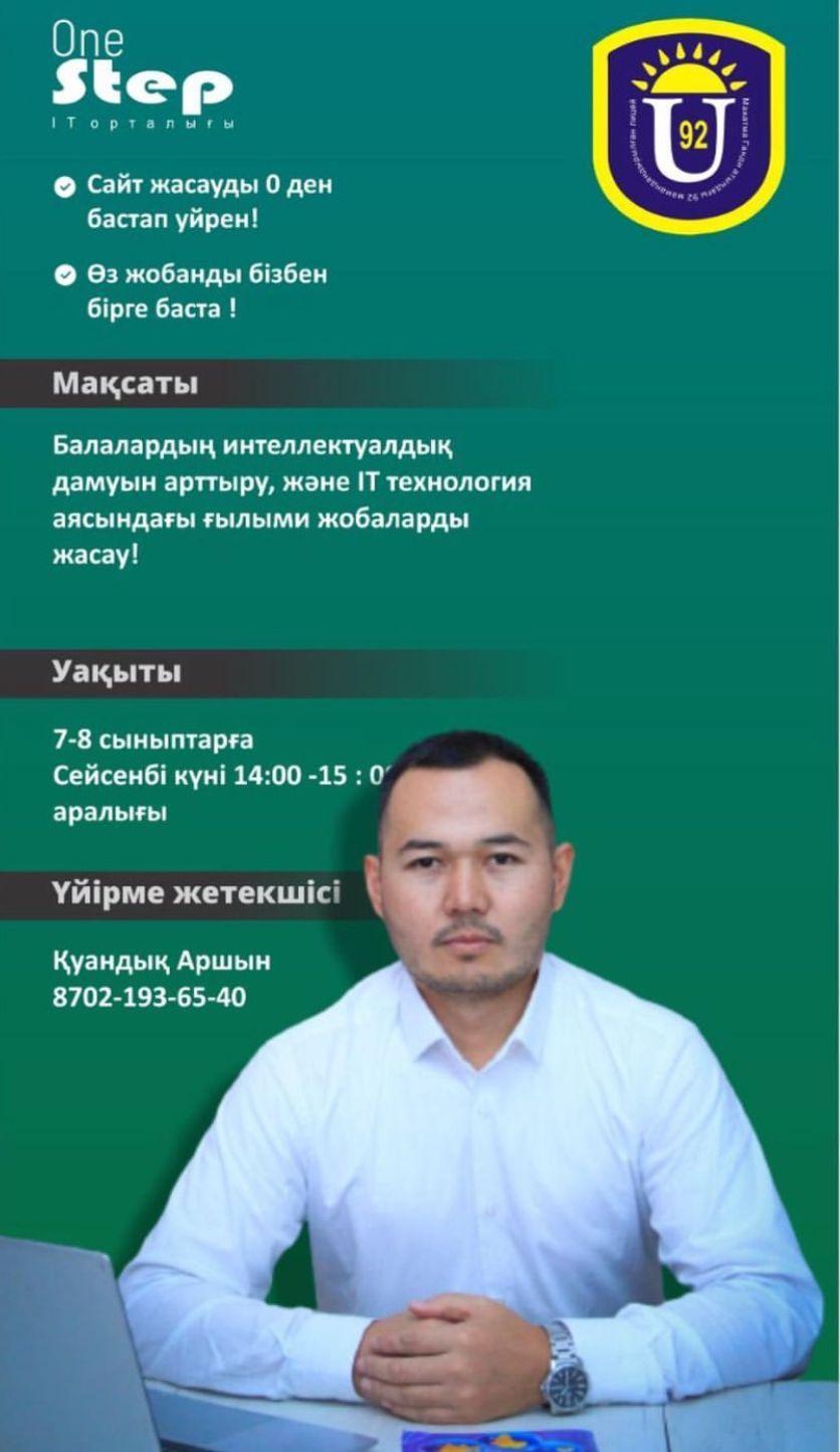19 сентябрь 2022 0 1 2 3 4 5 One Step IT орталығы үйірмесі ? Хабарландыру!М.Ганди атындағы №92 мамандандырылған лицейде 7-8 сынып оқушылары арасында One Step IT орталығы үйірмесіне қабылдау жүріп жатқанын хабарлаймыз! Үйірме жетекшісі: Қуандық Аршын