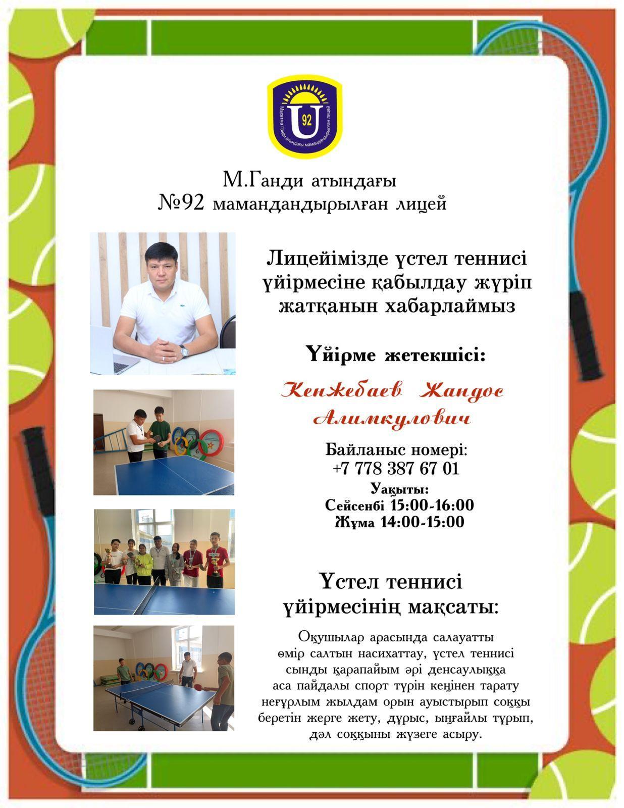20 сентябрь 2022 0 1 2 3 4 5 Үстел теннисі үйірмесі ? Хабарландыру!М.Ганди атындағы №92 мамандандырылған лицейде үстел теннисі үйірмесіне қабылдау жүріп жатқанын хабарлаймыз! ?Үйірме жетекшісі: Кенжебаев Жандос Алимкулович