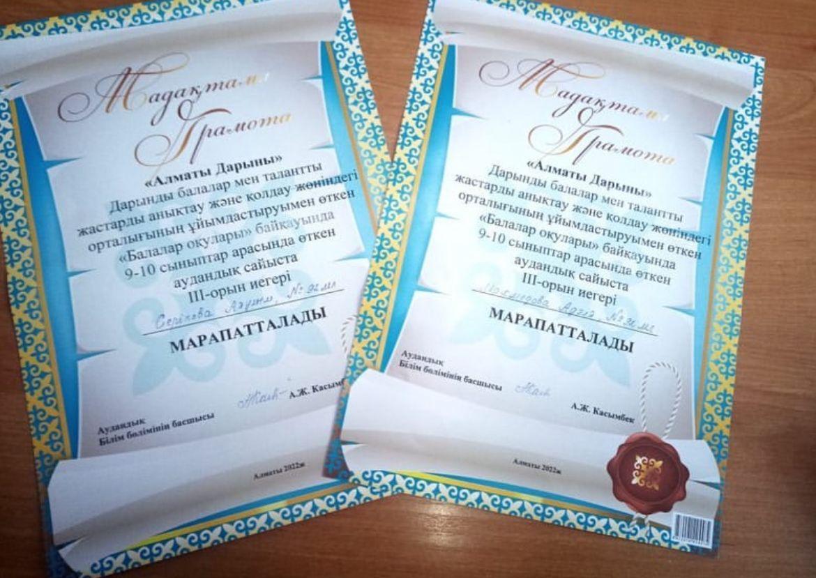 23 қыркүйек 2022 жылы "Оқуға құштар мектеп" іс-шарасының аясында аудандық байқау өткізілді. Оқушылар І.Есенберлиннің "Алмас қылыш", Д. Дефоның "Робинзон Крузо" романдарын оқу бойынша сайысқа түсіп, 10 "Г" сынып оқушысы Серікова Аяулым мен 9 "Г" сынып оқушысы Махмедова Адэля жүлделі ?3-орынға ие болды.