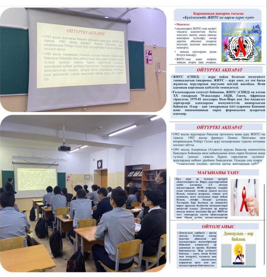 29 қараша 2022 жылы 10 «А» сыныбында 1 желтоқсан – Бүкіләлемдік ЖИТС-ке қарсы күрес күніне орай «Ғасыр дерті» тақырыбында сынып сағаты өткізілді.