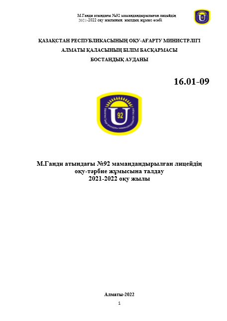 КГУ «Специализированный лицей №92 имени Махатма Ганди» Управления образования города Алматы