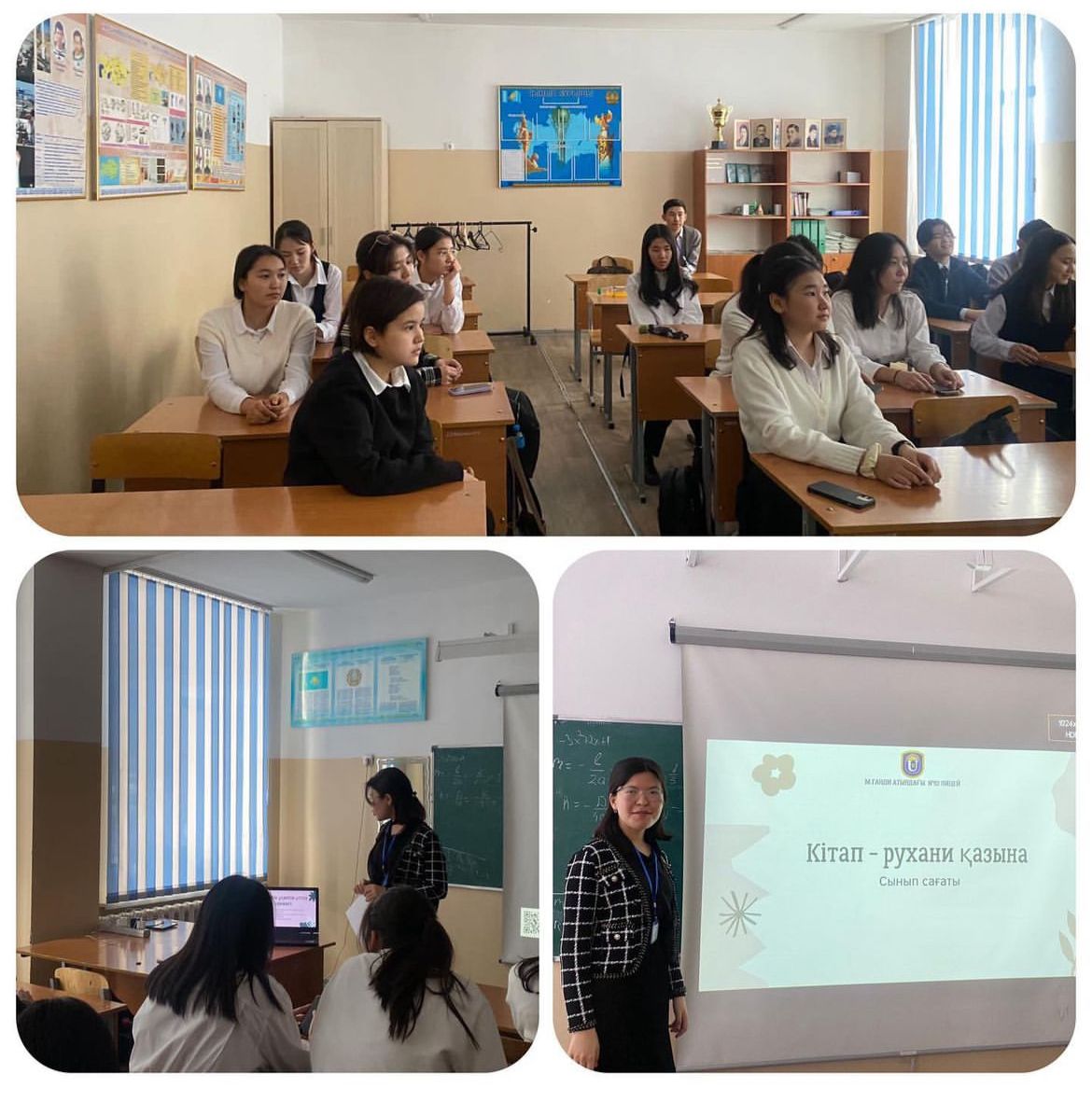07.02.2023 жылы 10 “Г” сыныбында "Кітап-рухани қазына" атты сынып сағаты өткізілді. Сынып сағатын Абай атындағы Қазақ Ұлттық Педагогикалық Университеті, Химия кафедрасының 3 курс студенттері өткізді.