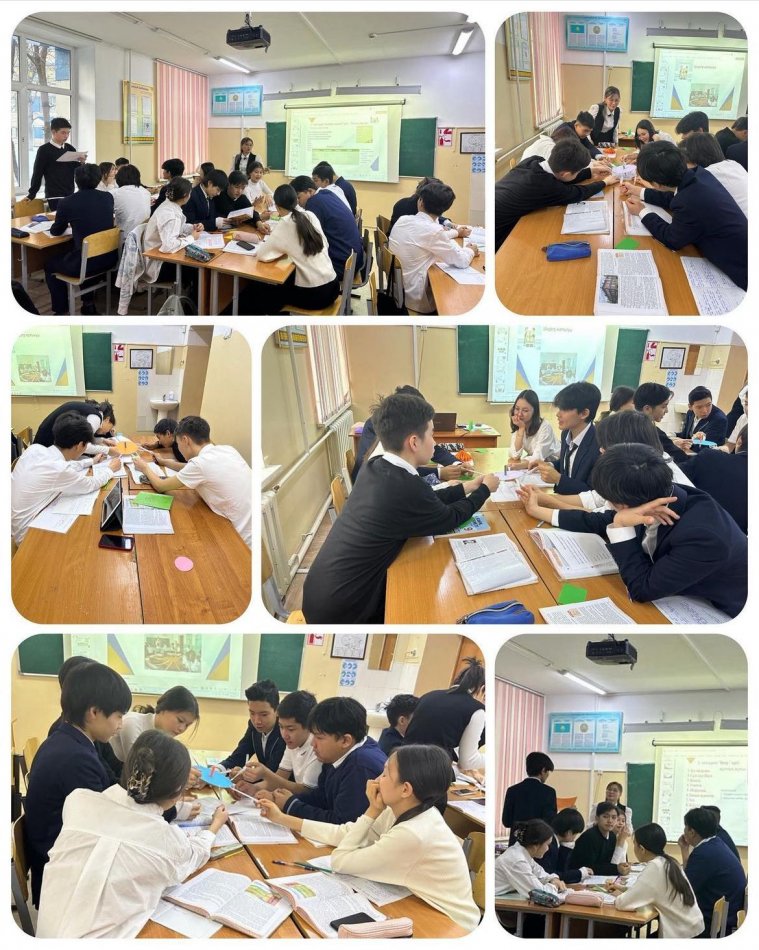 Ең алдымен оқушыларды түрлі түсті фигугалардың көмегімен топқа бөліп, жеке, жұптық, топтық тапсырмалар орындады. Жаңа материалды меңгерту барысында , “Веер”әдісі, “Әдебиет лотосы”,”Сатылай- кешенді талдау”, “Жағдаяттық сұрақтар”, "Мағынаны таны", "Т- кестесі" әдістерін тиімді пайдалана білді.