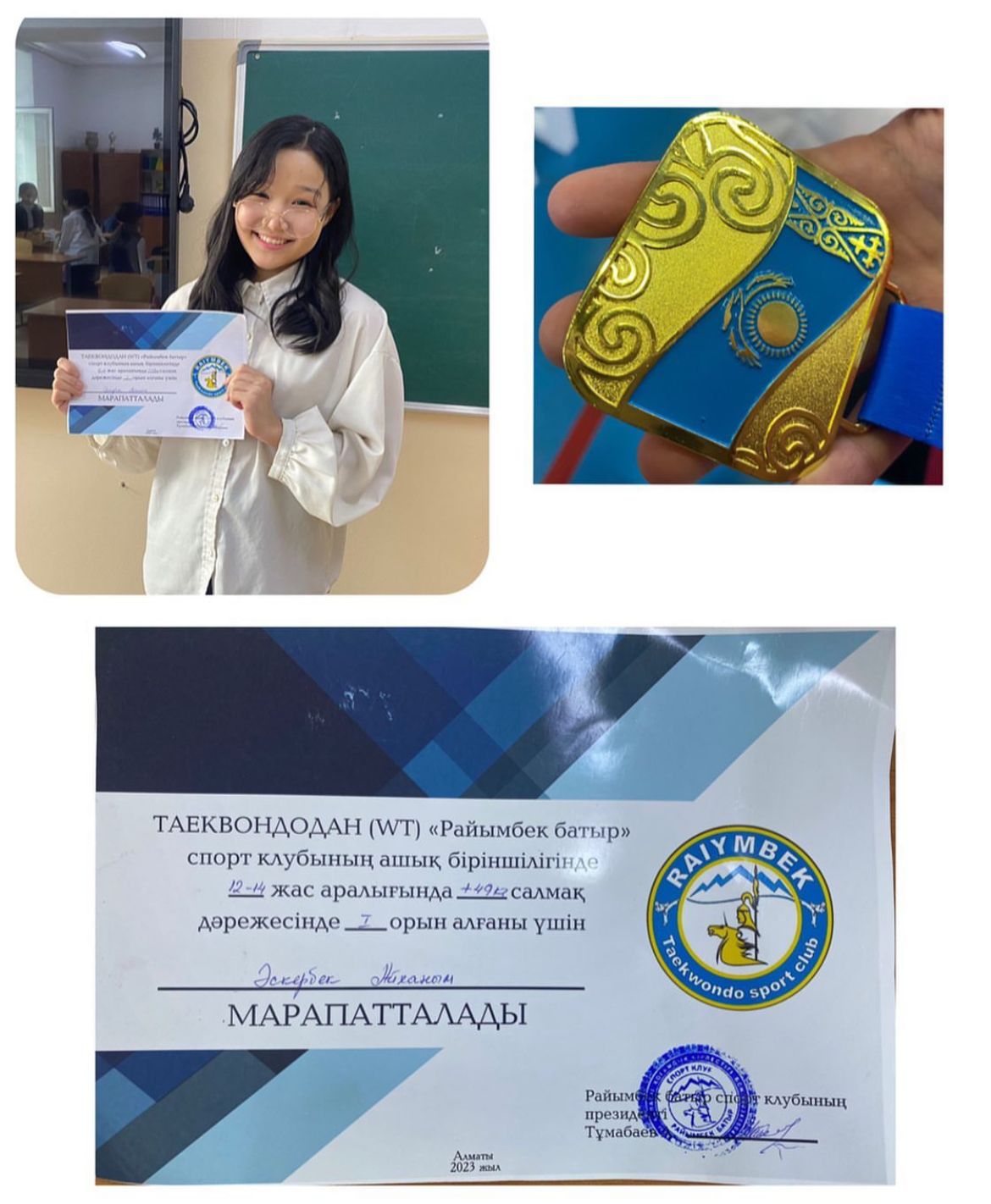 Таеквондодан «Райымбек батыр» спорт клубының ашық біріншілігінде 12-14 жас аралығында +49 кг салмақ дәрежесінде I орын алғаны үшін лицейіміздің 8 “Ә” сынып оқушысы Әскербек Айханым марапатталды! Құттықтаймыз!