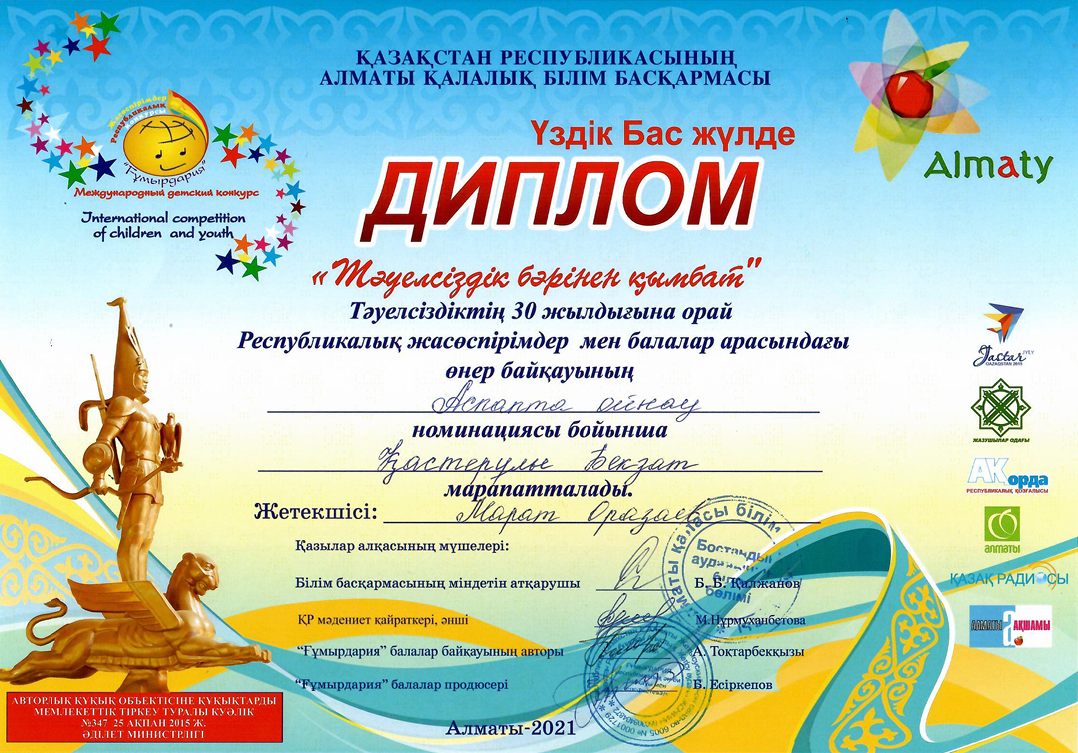 ҚР Алматы қаласы Білім Басқармасы ұйымдастыруымен «Тәуелсіздіктің 30 жылдығына орай Республикалық « Тәуелсіздік бәрінен қымбат»өнер байқауына белсене қатысып егемен еліміздің ертеңін ойлайтын, зерделі де зейінді, қабілетті де қайрымды, адал перзент, өнерлі шәкірт тәрбиелеген үздік ұстаз Марат Оразаев марапатталды.