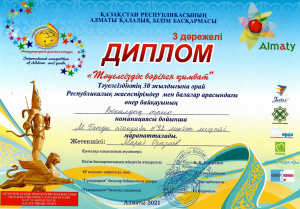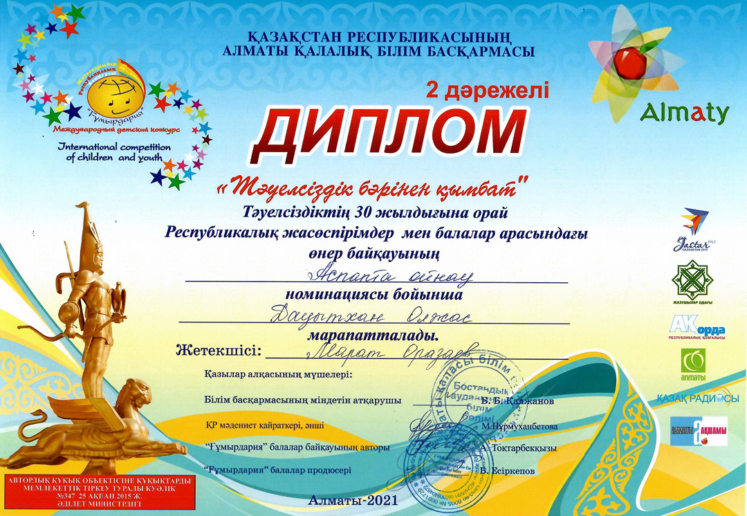 ҚР Алматы қаласы Білім Басқармасы ұйымдастыруымен «Тәуелсіздіктің 30 жылдығына орай Республикалық« Тәуелсіздік бәрінен қымбат» жасөспірімдер мен балалар арасындағы өнер байқауының Аспапта ойнау номинациясы бойынша Дауытхан Олжас 2 дәрежелі дипломымен марапатталды.