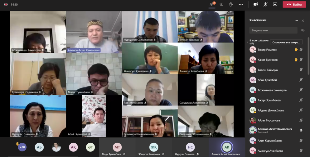 Сонымен бірге Педагогикалық шеберлік орталығының тренері Алимов Асхат Камзаевич семинар барысында мұғалімдермен онлайн кездесті. Кездесу барысында Асхат Камзаевич мұғалімдердің қойған сұрақтарына жауап бере отырып, қашықтан оқыту кезіндегі сабақты зерттеуді ұйымдастырудың тиімді, өзекті жолдарын ұсынып, өзінің құнды ой-пікірлерімен бөлісті. Семинарға лицей ұстаздары белсене қатысты.