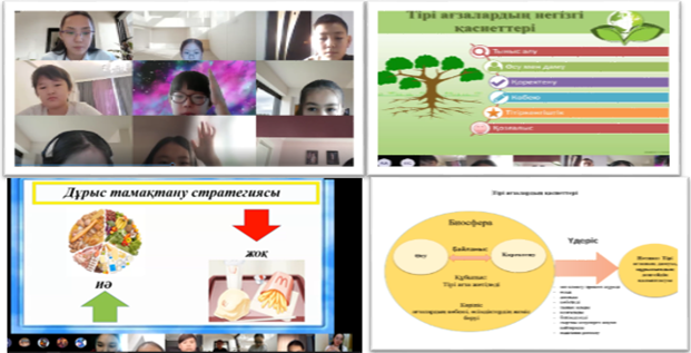 Ең алдымен, мұғалім оқушылардан өткен сабақты еске түсіру мақсатында «Кім шапшаң» әдісін қолданда отырып, экранға сұрақтар шығарды. Оқушылар сұрақтардың барлығына дұрыс жауап берді. Жаңа сабақты мұғалім «bilimland.kz» сайтын қолданып видео көрсетті, және презентациямен тірі ағзалардың негізгі қасиеттерін түсіндірді. Жаңа сабақты игеру мақсатында оқушыларға өзіндік жұмыстар берілді. Зерттеу жұмысы ретінде оқушылар берілген мәтінді оқып, соған тән қасиетті анықтады. Оқушылар зерттеу бөлімін жалпылаумен байланыстыра алды. Жаңа сабақты қорытындылау мақсатында мұғалім «Метатаным педагогикасының» таным деңгейлерін сақтай отырып «Метасызба» ұсынды, сабақты метасызба арқылы қорытындылады.