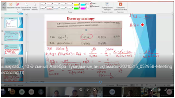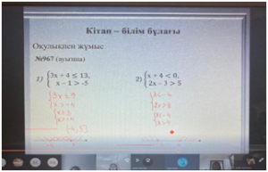 Мұғалім жаңа сабақты оқушылардың алдыңғы сабақтарда алған білімдерімен байланыстыра отырып, түсіндірді. Есептіерді онлайн тақтада оқушылармен бірлесе орындауы ұтымды болды.