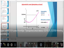 «Туындының анықтамасы» тақырыбында 15.02.2021 күні Математика және информатика пәндері бірлестігінің он күндігі аясында математика пәнінің мұғалімі Шалқар Бекзат Қырқынбайұлы 10 «Ә» сыныбына онлайн ашық сабақ өткізді.