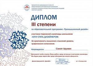 ҚР Білім және ғылым министрлігі халықаралық білім беру корпарациясы Қазақ бас сәулет-құрылыс академиясы дизайн факультеті «Өнеркәсіптік дизайн білім беру бағдарламасы» бойынша  ұйымдастырған, «Дизайнер болғым келеді»  оқушылардың шығармашылық олимпиадасының қатысушысы 11 "Б" сынып оқушысы Самат Аружан  Ойлау қабілеті мен графикалық орындалудың жоғары деңгейі үшін III дәрежелі дипломымен марапатталды.