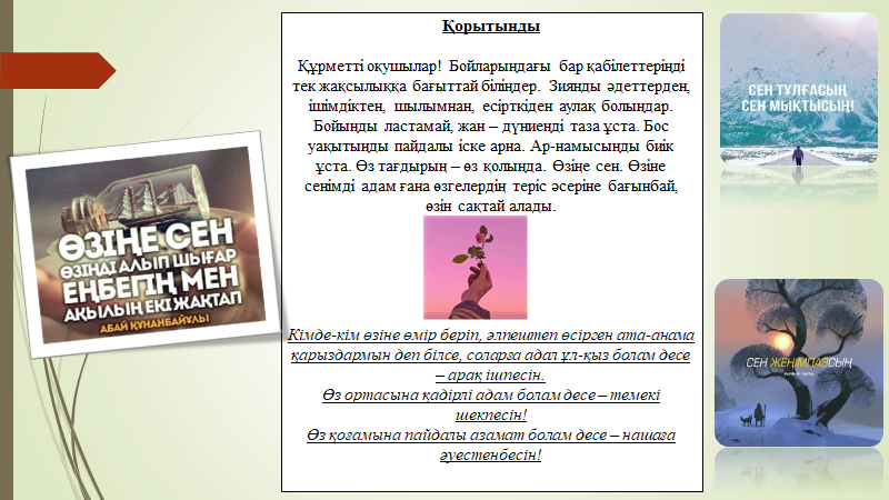 Салауатты өмір салтын насихаттай отырып, табиғаттың адам баласына сыйлаған басты байлығы денсаулықты сақтаудың басты қағидалары: ✅оқушыларды зиянды әдеттерден бойларын аулақ ұстауға;