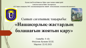 "Нашақорлық-жастардың болашағын жоятын қару" тақырыбында 8 "Б" сынып оқушыларына сынып сағаты өтілді.
