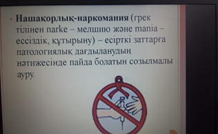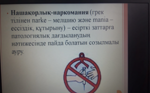 Мақсаты: Қазіргі уақыттағы қоғамның, мемлекеттің ең өзекті мәселесі-нашақорлықтың өршіп бара жатқаны туралы оқушыларға түсіңдірме жұмыстары жүргізіліп, нашақорлық,есірткі дегеніміз не?, Оның адамзатқа қандай зиян әкеледі деген сұрақтард