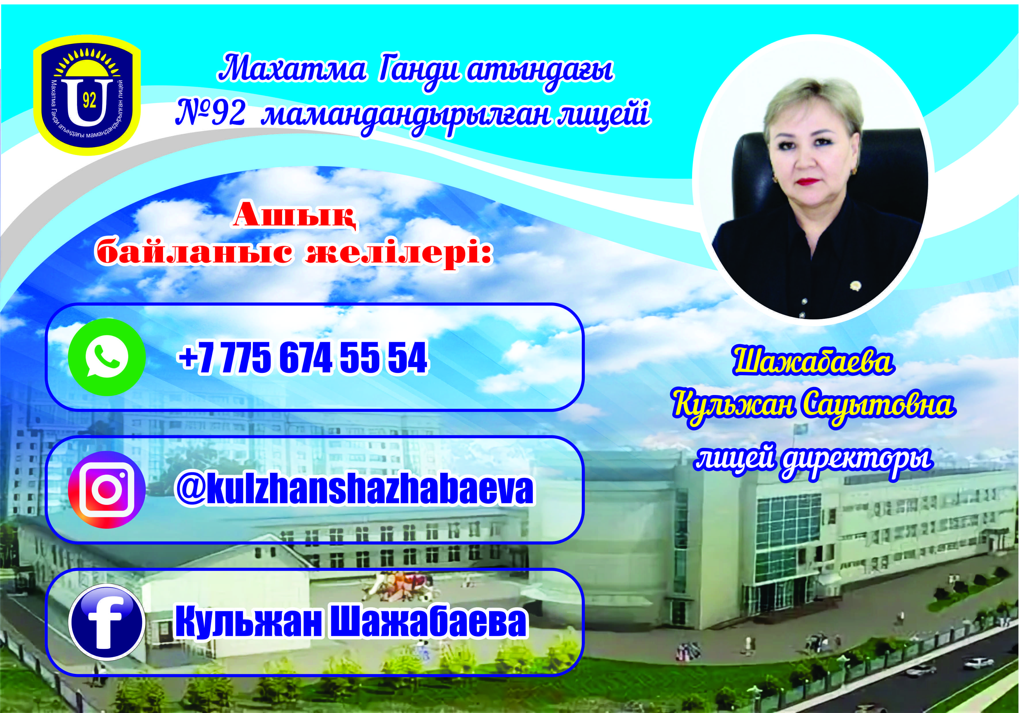 Алматы қаласы Білім басқармасының "Махатма Ганди атындағы №92 мамандандырылған лицейі" КММ директоры