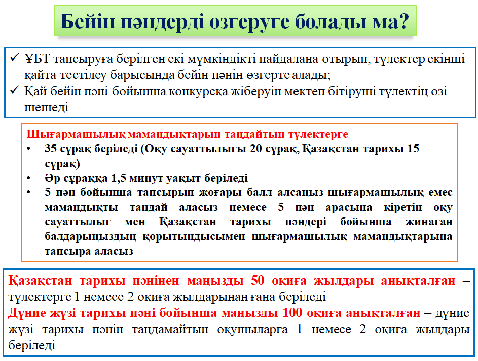 | Наурыз | Түлектерге міндетті емес Ақылы түрде Тестілеу нәтижесі тек ақылы бөлімге түсуге жарамды |