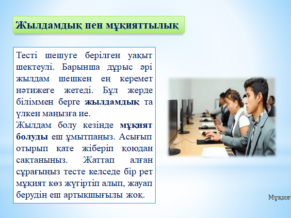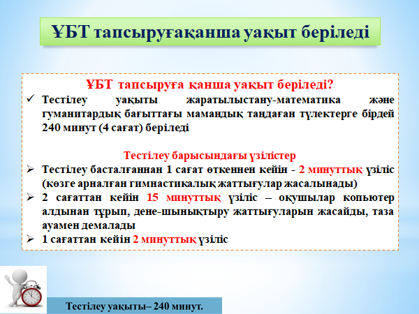 Егер бұған дейін әрбір оқушыға тест тапсырмалары бар кітапша берілсе, енді дербес компьютер ұсынылады.ҰБТ тапсыру белгілі бір күнге ғана белгіленбейді, үш айға созылады.