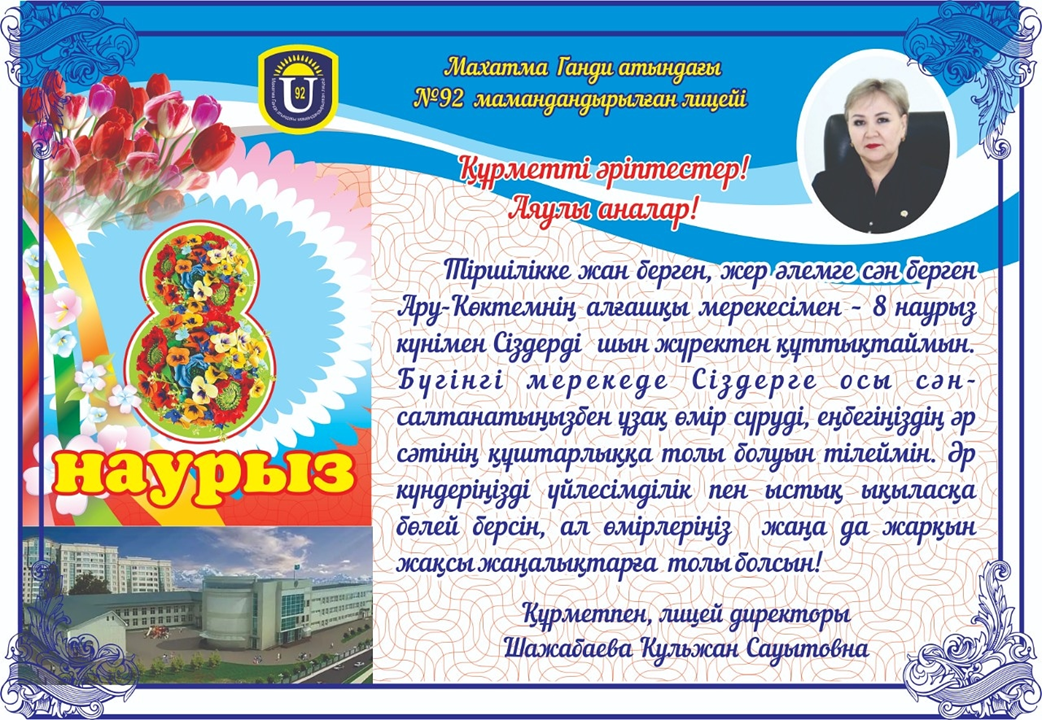 Көктемнің гүліндей құлпырып, әсемдіктің, әдеміліктің, әдептіліктің иесі болып қала беріңіздер!Жанарларыңыз әрдайым нұр шашып, жүздеріңіз күндей күлімдеп жүрсін! Көңілдеріңіз көктемдей көрікті болсын!