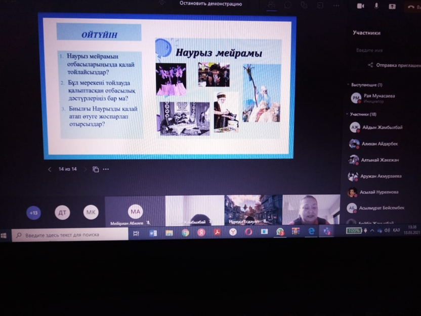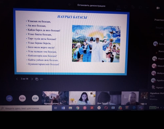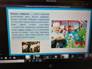 Наурыз мерекесіне орай, Ұлттық салт-дәстүрді насихаттау мақсатында 8 «А» сынып жетекшісі Мунасаева Рая Нуровнаның бастамасымен «Жыл басы – Наурыз!» тақырыбында ашық тәрбие сағаты өткізілді. Тәрбе сағатының негізгі мақсаты: