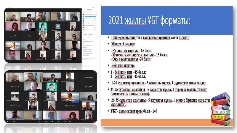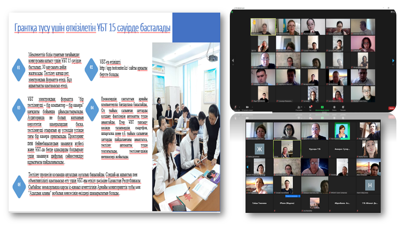 ?Онлайн кездесу барысында 11- сынып оқушыларының ата-аналары тарапынан Ұлттық Бірыңғай Тестілеу бойынша және қорытында аттестаттау емтиханы жайында қойылған барлық сұрақтарға жауап берілді.