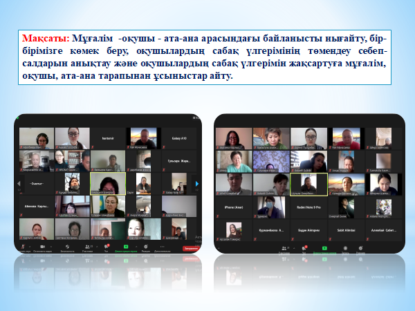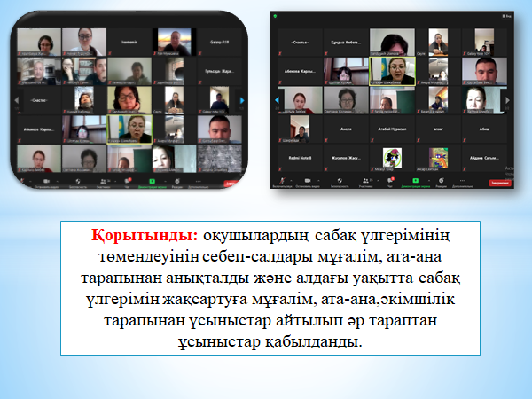 Нәтиже: оқушылардың сабақ үлгерімін жақсарту жолында мұғалім, оқушы, ата-ана тарапынан ұсыныстар айтылып, шешім қабылданды.