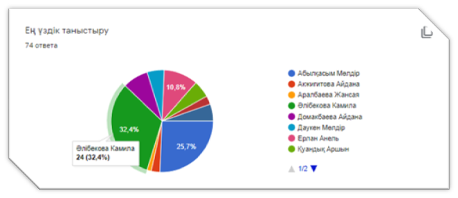 Жас мамандардың таныстыру видеоларына 74 мұғалім дауыс беріп. Әлібекова Камила ең көп дауыс жинап жоғарғы 10 баллға ие болды.
