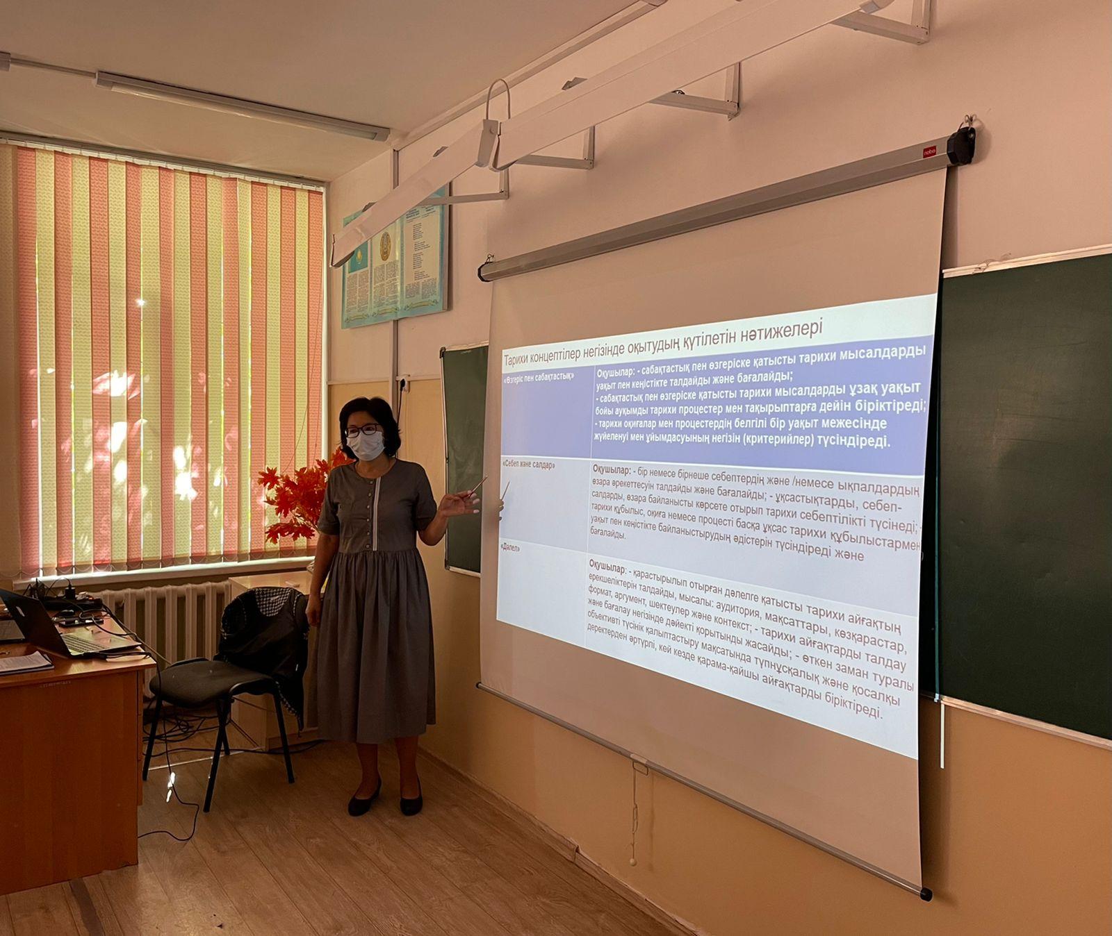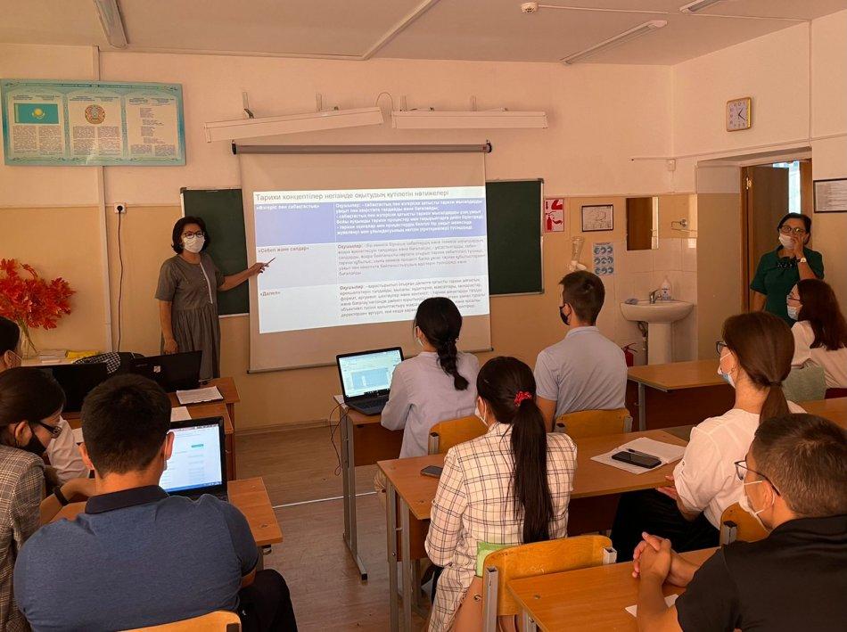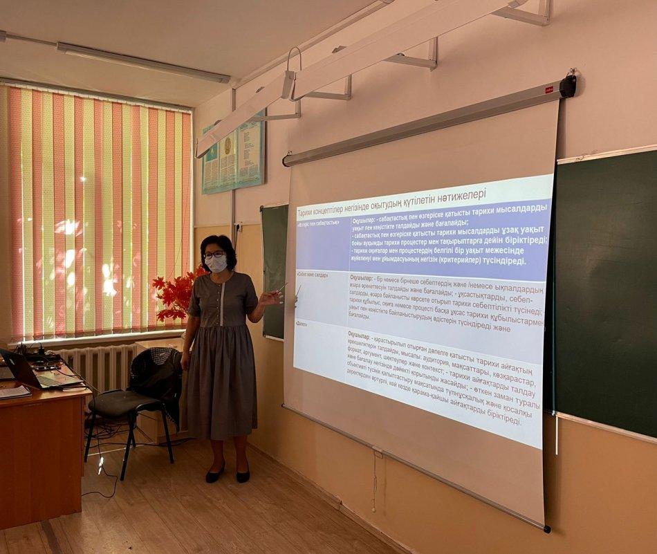 Сонымен қатар, тарих пәнінің тәжірибиелі мұғалімі Сандуғаш Сабырқызы көрсетілген алгоритмдер негізінде 8 сыныпқа арнап жасаған “Қазақстан тоталитарлық жүйе кезеңінде” атты бөлім бойынша жиынтық бағалаудың үлгісімен таныстырды. Бөлім бойынша жиынтық бағалаудың тақырыбы, оқу мақсаттары, бағалау критерийлері, ойлау дағдыларының деңгейлері қалай жасалу керектігі талданып айтылды. Бүгінгі әдістемелік семинар арқылы жас мамандар бөлім бойынша жиынтық бағалау тапсырмалары қандай алгоритмдерге сүйене отырып әзірленетіндігі туралы мағлұматтарға қанық болды.