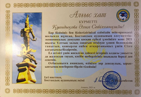 Бостандық ауданының әкімінің Алғыс хаты