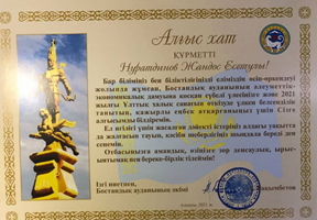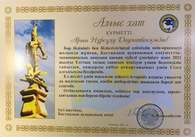 Бостандық ауданының әкімі Рақымбетов Алтай Ерғазыұлынан Алғыс хат алды.