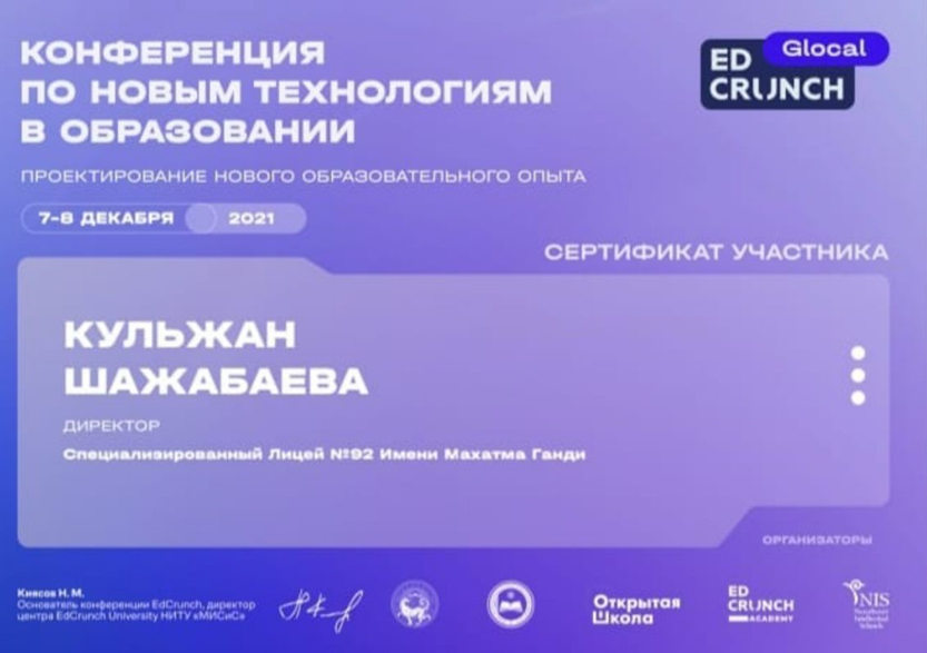Лицей директоры Шажабаева Кульжан Сауытовна жаңа технологиялар әлеміне байланысты "EdСrunch Gloсаl" атты халықаралық конференцияға қатысып тәжірибе қоржынын толықтырды.