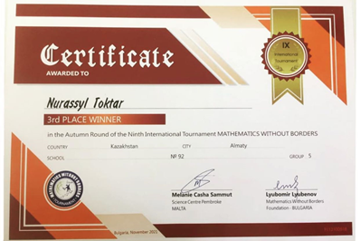 11 декабрь 2021 0 1 2 3 4 5 "Шексіз математика" халықаралық турнирі Лицейіміздің 5 сынып оқушысы Тоқтар Нұрасыл Жәнібекұлын "Шексіз математика" халықаралық турнирінің күзгі турында 3-ші орын алуымен құттықтаймыз!???