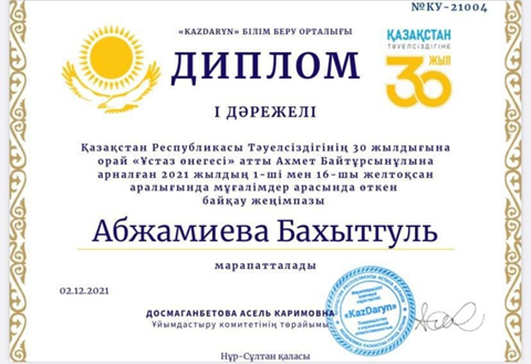 Лицейіміздің орыс тілі пәні мұғалімі Абжамиева Бахытгуль Қазақстан Республикасы Тәуелсіздігінің 30 жылдығына орай "Ұстаз өнегесі" атты Ахмет Байтұрсынұлына арналған 2021 жылдың 1-ші мен 16-шы желтоқсан аралығында мұғалімдер арасында өткен байқауда I ДӘРЕЖЕЛІ дипломмен марапатталды!