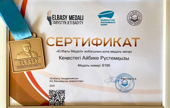 М.Ганди атындағы #92 мамандандырылған лицейінің 10”А” сынып оқушысы Кеңестегі Айбике Рүстемқызы “Елбасы Медалі” жобасының қола медаль иегері атанды.