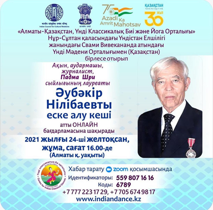 Бүгін Махатма Ганди атындағы #92 мамандандырылған лицеймен бірге “Алматы-Қазақстан, Үнді Классикалық Биі және Йога Орталығы” Нұр-Сұлтан қаласындағы Үндістан Елшілігі жанындағы Свами Вивекананда атындағы Үнді Мәдени Орталығымен (Қазақстан) бірлесе отырып ақын, аудармашы, журналист, Падма Шри сыйлығының лауреаты Әубәкір Нілібаевты еске алу кеші атты онлайн бағдарлама өтті. Лицейіміздің 9,10,11 сынып оқушылары түгел қатысты.