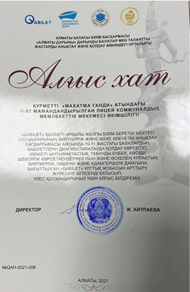 “QABILET” қызметі арқылы жалпы білім беретін мектеп оқушыларының зияткерлік және жеке әлеуетін анықтау бағдарламасы аясында 10-11 жастағы балалардың қабілеттерін диагностикалауда қолдау көрсетіп, жемісті ынтымақтастық, табанды еңбек, кәсіби шеберлік көрсеткендеріңіз үшін және өскелең ұрпақтың зияткерлік, мәдени және адамгершілік дамуына бағытталған “QABILET” ұлттық жобасын арттыру жүйесіне белсенді қатысып, үлес қосқандарыңыз үшін “Махатма Ганди” атындағы #92 мамандандырылған лицей коммуналдық мемлекеттік мекемесі әкімшілігіне алғыс білдірілді!!!