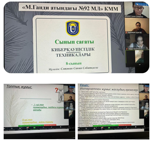 Махатма Ганди атындағы №92 мамандандырылған лицейдің 8 «Д» сынып оқушыларына “Киберқауіпсіздік техникалары” тақырыбында сынып сағаты өткізілді.