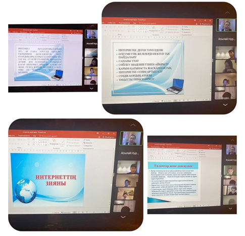 Сынып сағатында оқушылар «Ғаламтордың тарихы» тақырыбында презентация қорғады. «Интернет: өткені мен болашағы» бейнежазбасын тамашалап, ой қорытты. «Ғаламтордың денсаулыққа әсері» тақырыбында қысқаша шолу жасады.