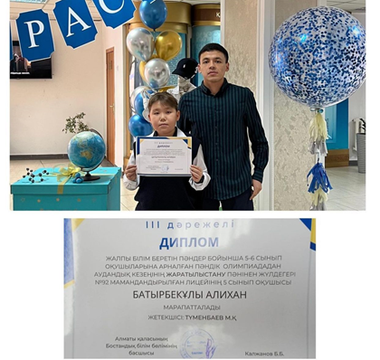 М.Ганди атындағы №92 мамандандырылған лицейінің 5 «В» сынып оқушысы Батырбекұлы Алихан жалпы білім беретін пәндер бойынша 5-6 сынып оқушыларына арналған пәндік олимпиаданың аудандық кезеңінде жаратылыстану пәнінен III дәрежелі дипломмен марапатталды!!!