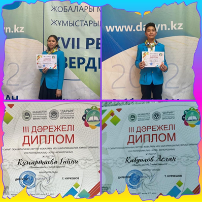 2-7 сынып оқушыларының зерттеу жобалары мен шығармашылық жұмыстарының XVII Республикалық «Зерде» конкурсында лицейіміздің 7 сынып оқушылары Кумартаева Гайни және Қабдолов Аслан III дәрежелі дипломмен марапатталды!!!