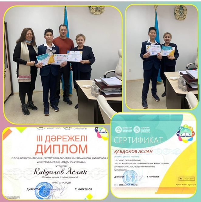2-7 сынып оқушыларының зерттеу жобалары мен шығармашылық жұмыстарының XVII Республикалық «Зерде» конкурсында лицейіміздің 7 «Г» сынып оқушысы Қабдолов Аслан III дәрежелі дипломмен және сертификатпен марапатталды!!!
