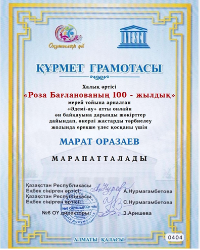 Лицейіміздің музыка пәні мұғалімі, ақын-композитор Оразаев Марат ағайымыз «Роза Бағланованың 100 - жылдық» мерей тойына арналған «Әдемі-ау» атты онлайн ән байқауында дарынды шәкірттер дайындап, өнерлі жастарды тәрбиелеу жолында ерекше үлес қосқаны үшін марапатталды!