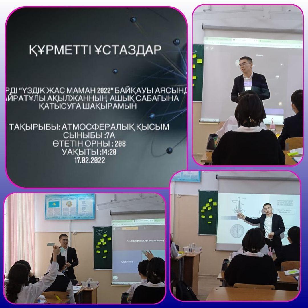 17 февраль 2022 0 1 2 3 4 5 Ашық сабақ: "Атмосфералық қысым" ?Мектепішілік «Үздік жас маман - 2022» байқауының екінші кезеңінің қатысушысы физика пәнінің мұғалімі Қайратұлы Ақылжанның ашық сабақ өту барысы?Ашық сабақ тақырыбы: Атмосфералық қысым