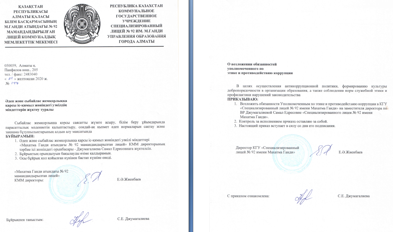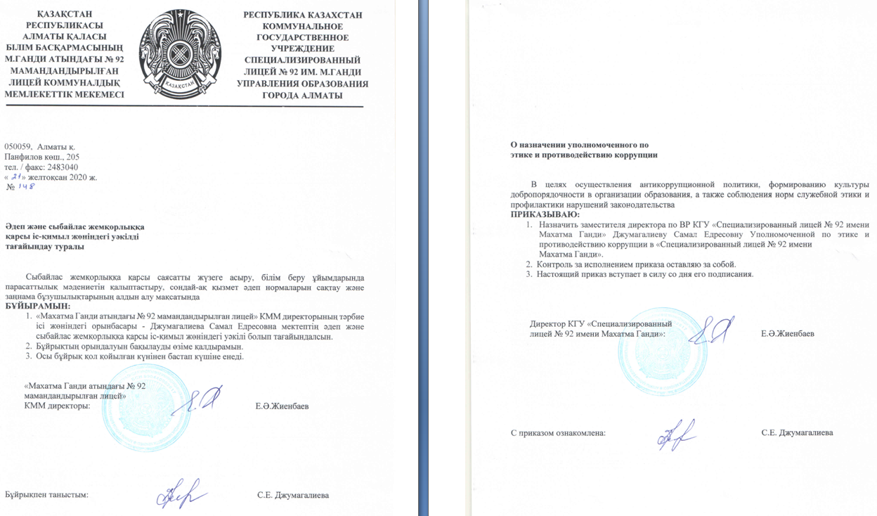 КГУ «Специализированный лицей №92 имени Махатма Ганди» Управления образования города Алматы