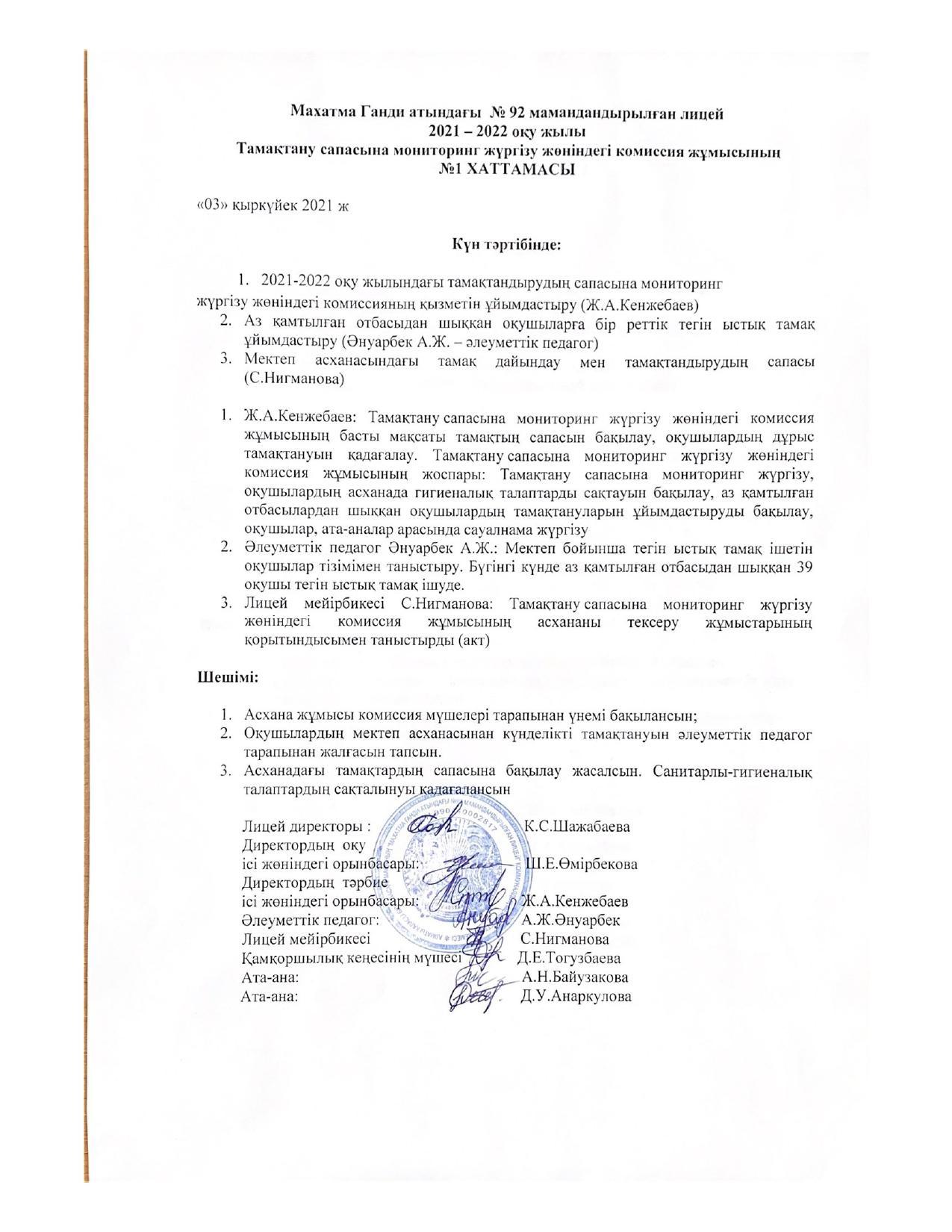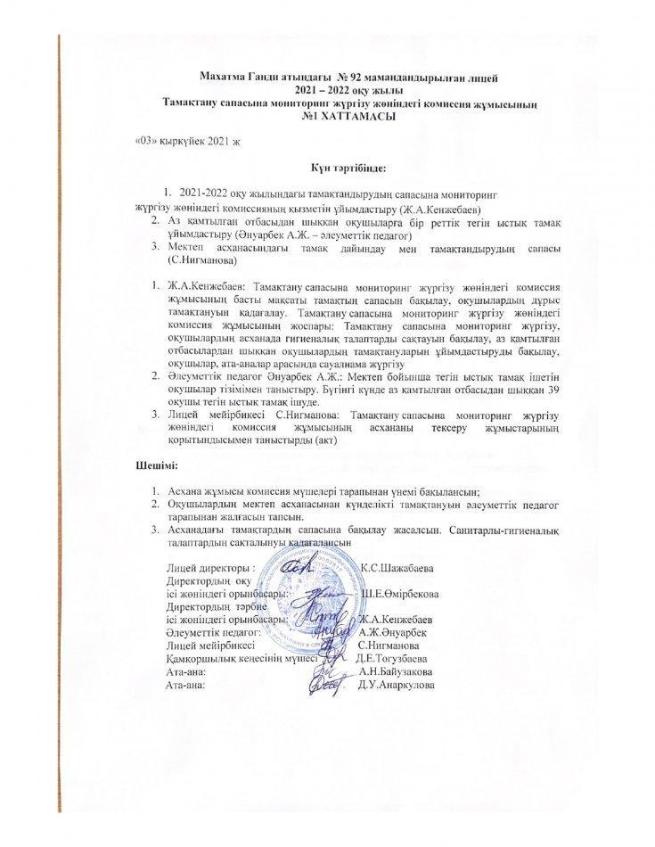 2021-2022 оқу жылына арналған тамақтану сапасына мониторинг жүргізу жөніндегі комиссия құру туралы бұйрық