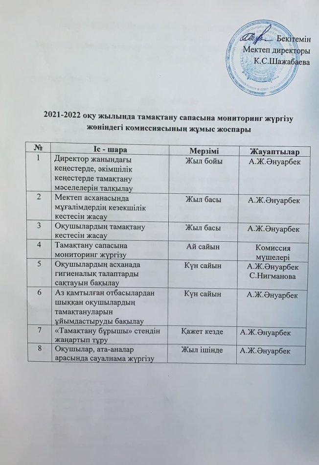 2021-2022оқу жылына арналған тамақтануды бақылау комиссиясының жоспары
