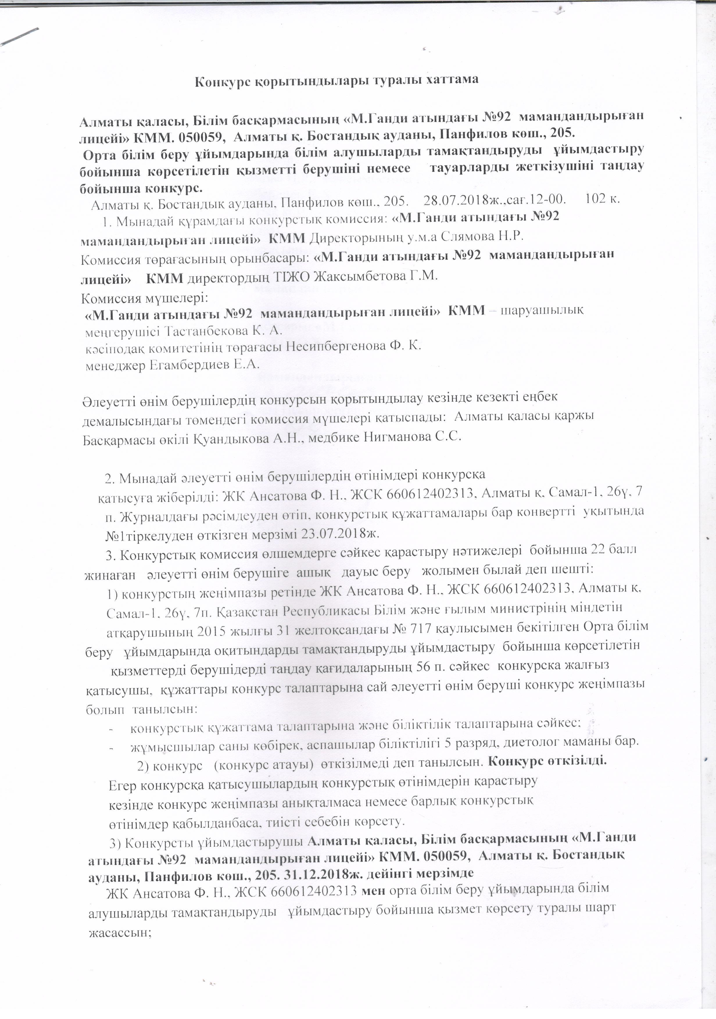 КГУ «Специализированный лицей №92 имени Махатма Ганди» Управления образования города Алматы